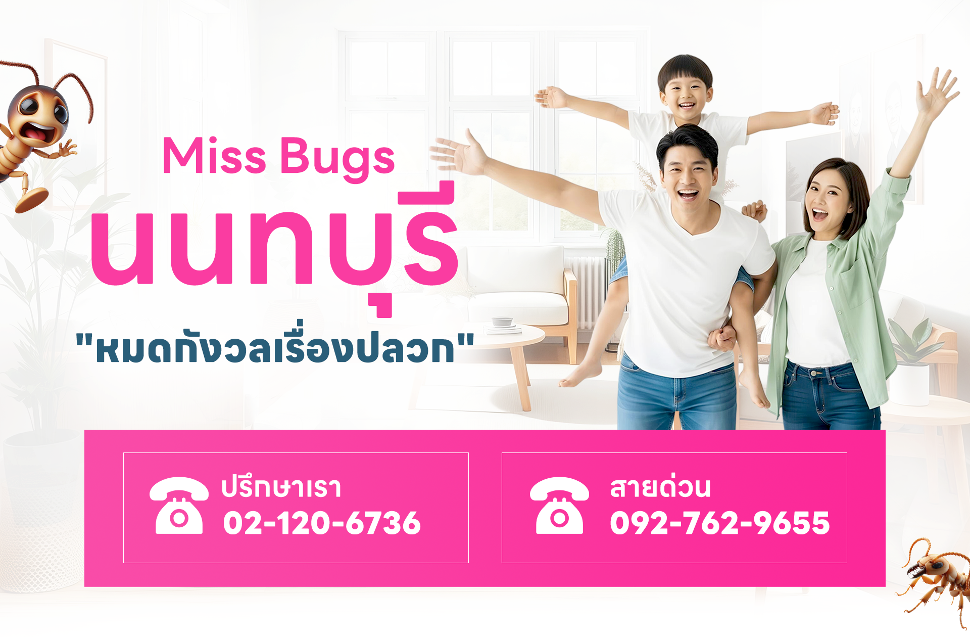 ให้บริการสำรวจ ฟรี พื้นที่ บางใหญ่ บางบัวทอง บางกรวย ไทรน้อย ปากเกร็ด เมืองนนทบุรี ให้คำแนะนำและประเมินราคาก่อนบริการฉีดปลวก บริการกำจัดปลวก นนทบุรี แก้ปัญหาปลวกขึ้นบ้าน ปลวกกินเฟอร์นิเจอร์บิ้วอิน